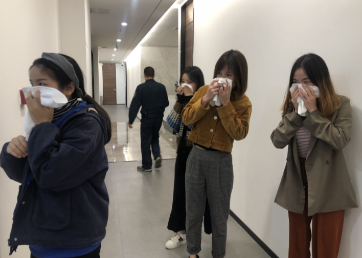 連忙通知AB辦公區人員,大家扔下手上的工作開始慢跑,畢竟是演習是吧!筆者在A區,跑到男廁所附近的安全通道開始下樓,煙很大,雖然是演習無毒煙,但仍然有一些嗆人,可視度很差,只能看到半米處前面的伙伴,開始大家還排成兩行,走了一層以后,發現的確太危險,因為看不清楚路,于是并成一排,靠在有護手的這一邊整齊下行,這時真的很慢了,想快也快不起來,而且已經有伙伴開始咳嗽了!我提醒前面的伙伴可以用衣服和圍巾當口罩會好一些,但感覺更慢了。大家走的急,走了N圈以后,我自己也不知道是到幾層了。