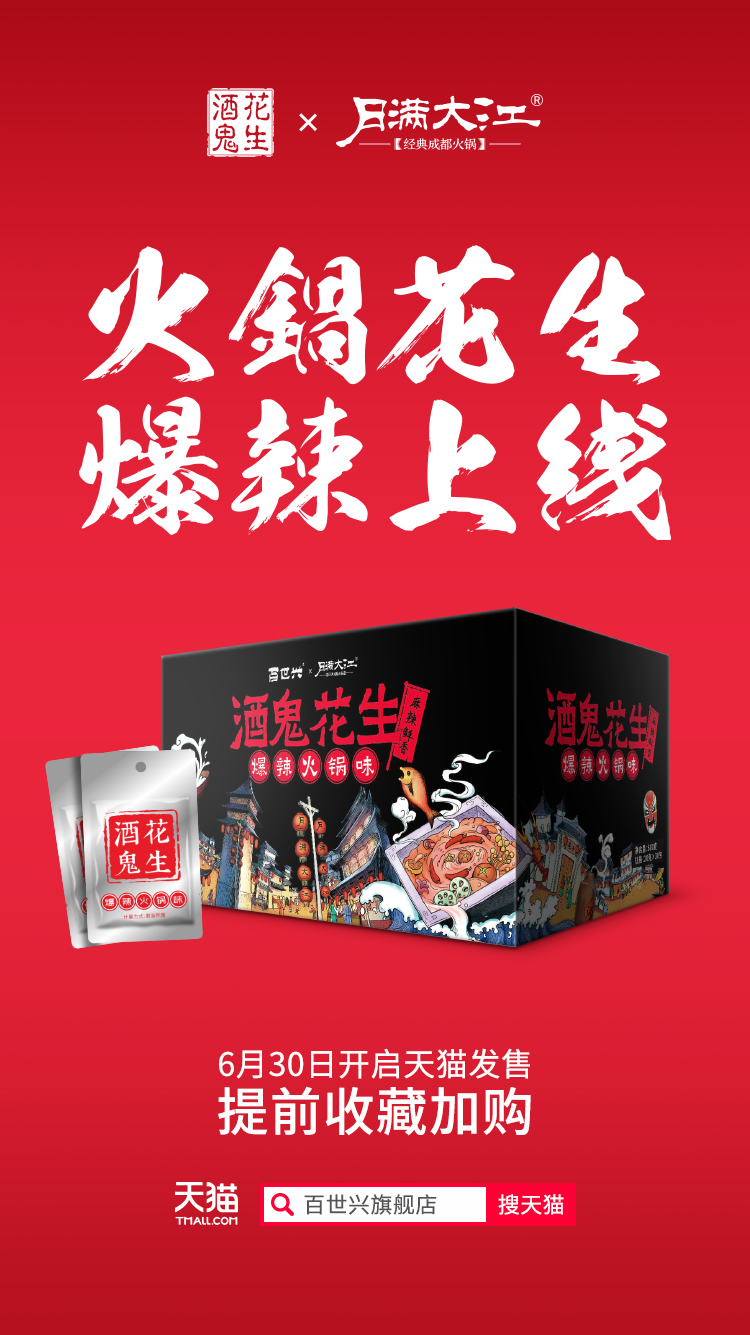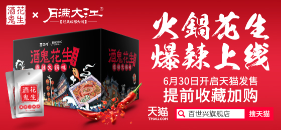 你想象過(guò)隨時(shí)隨地都能吃到火鍋嗎?你想象過(guò)兜里也能揣進(jìn)火鍋嗎?所有你想象的,一包即拆的火鍋味花生就可以滿足,酒鬼花生聯(lián)合月滿大江推出定制新品——酒鬼花生爆辣火鍋味,新品上市,快來(lái)嘗鮮!